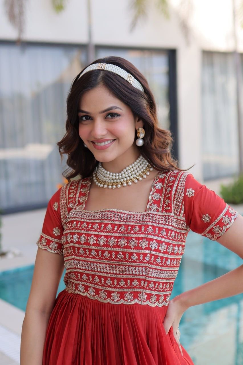 Mustard and red embroidered Anarkali gown for women festive wedding party wear