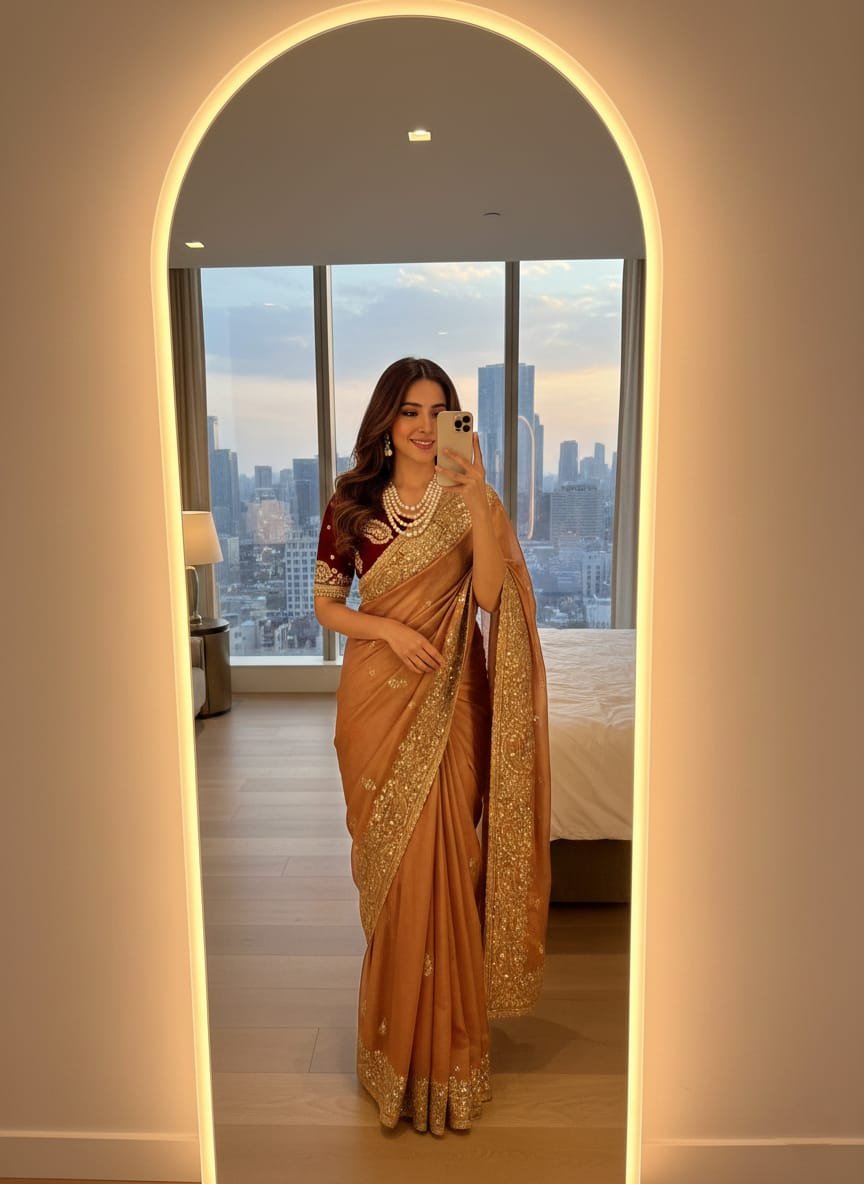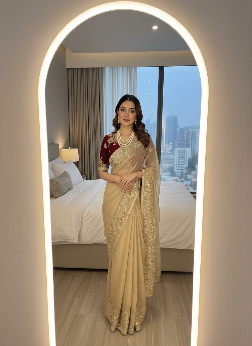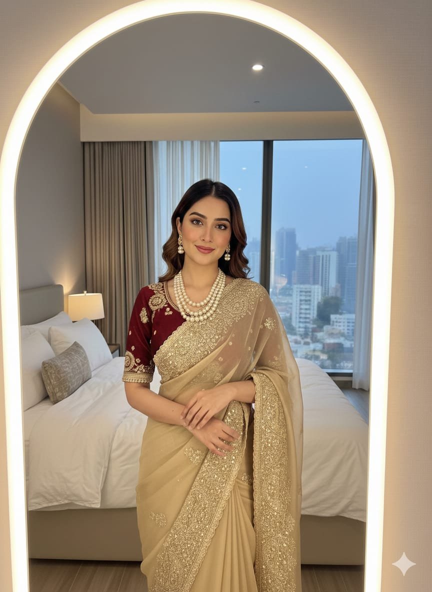 Very soft nd Elegant Rich look Fendy Sartin saree with beautiful embroidery 3 mm heavy sequence border nd buttis in all over saree..